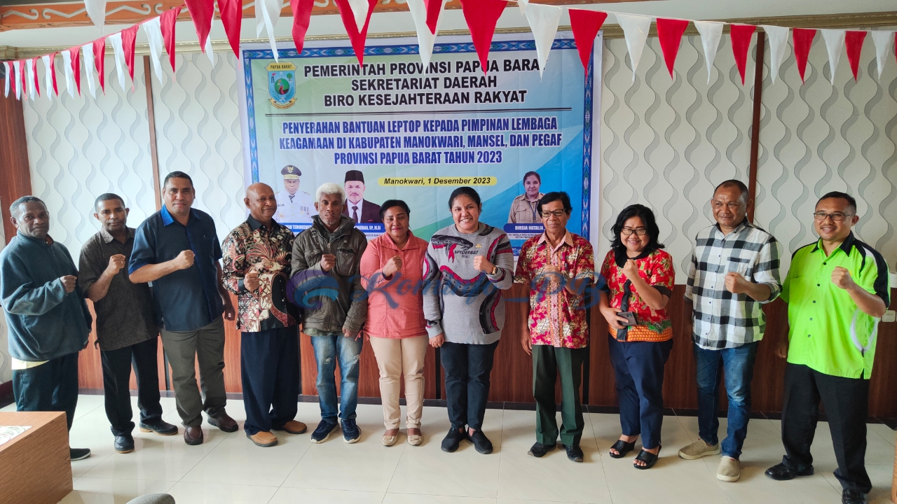 MANOKWARI - Sebagai bagian dari upaya mendukung kinerja administrasi dan sarana prasarana, Pemerintah Papua Barat melalui Biro Kesejahteraan Rakyat menyerahkan bantuan Laptop bagi lembaga keagamaan. Laptop dibagikan kepada perwakilan pimpinan lembaga Agama tersebar di Kabupaten Manokwari, Manokwari Selatan dan Pegunungan Arfak, Jumat (1/12/2023).