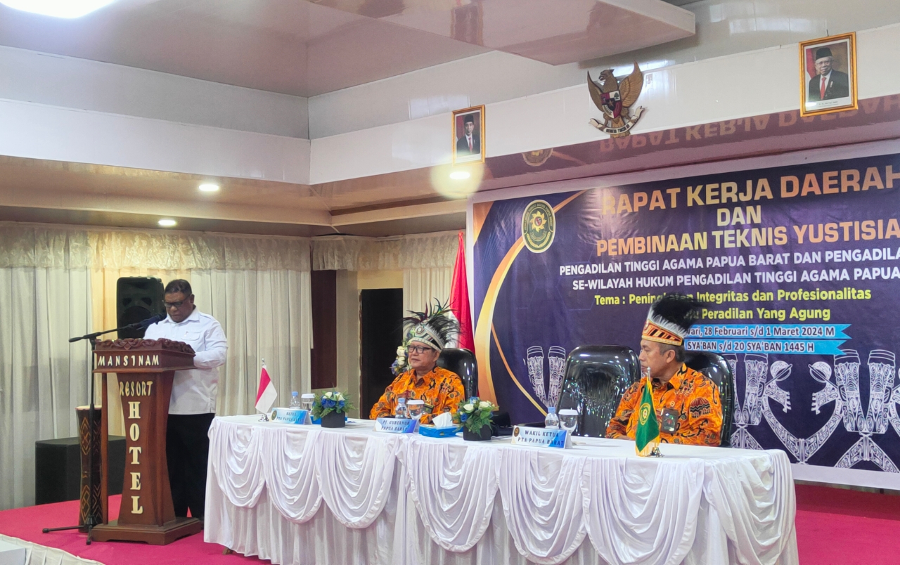 MANOKWARI - Penjabat Gubernur Papua Barat. Drs. Ali Baham Temongmere,MTP membuka Rakerda dan Pembinaan Teknik Yustisial Pengadilan Tinggi Agama Se-Papua Papua Barat. Atas nama Pemerintah mendukung dan komitmen tingkatkan sinergi demi pemenuhan hak hukum, agar selalu dapat berjalan dengan baik, Rabu (28/2/2024) dipusatkan pada salah satu hotel.