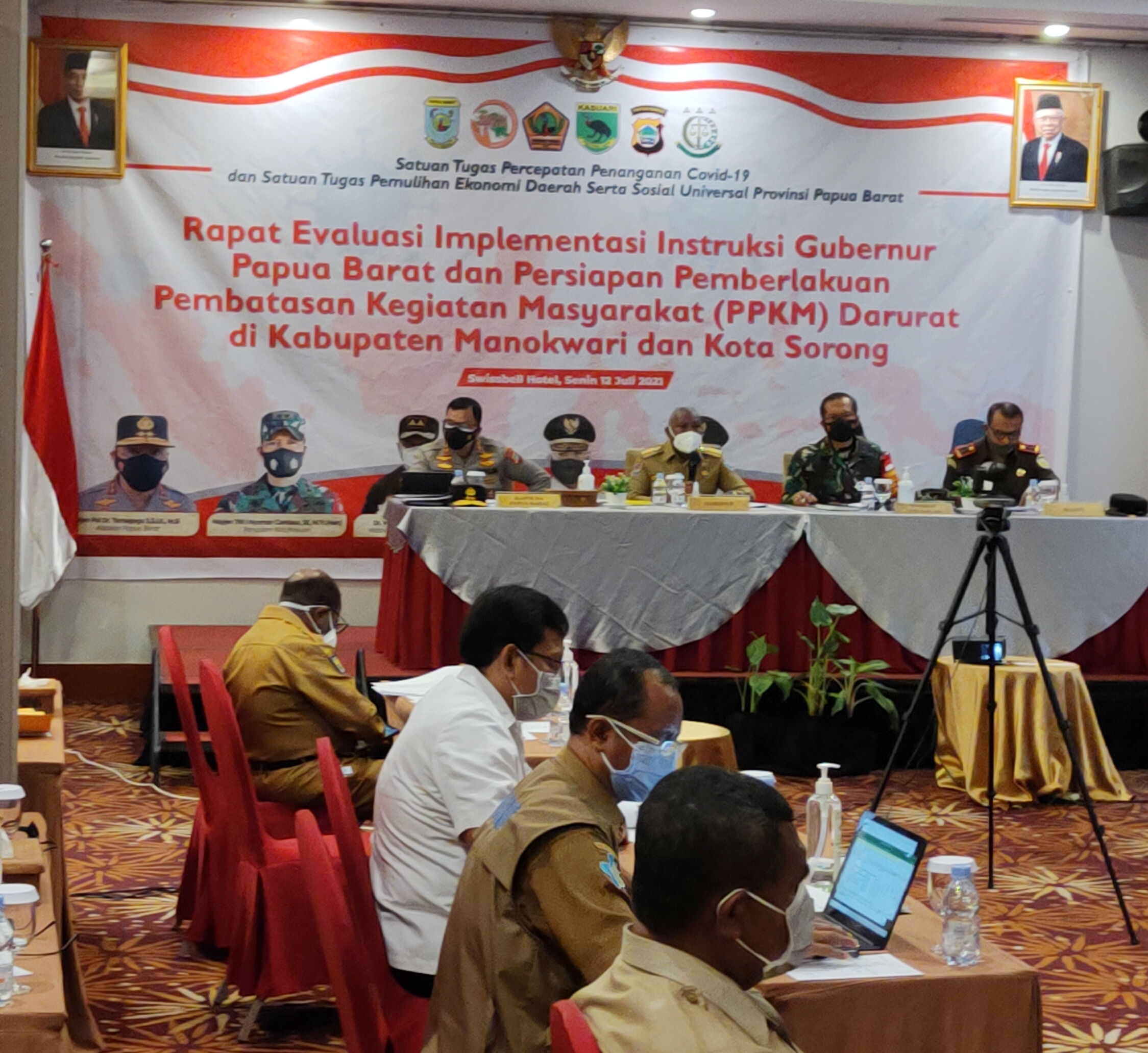 MANOKWARI- Rapat Evaluasi Implementasi Instruksi Gubernur Papua Barat dan Persiapan Pemberlakuan Pembatasan Kegiatan Masyarakat (PPKM) Darurat Kabupaten Manokwari dan Kota Sorong telah berlangsung, Senin (12/7/2021).