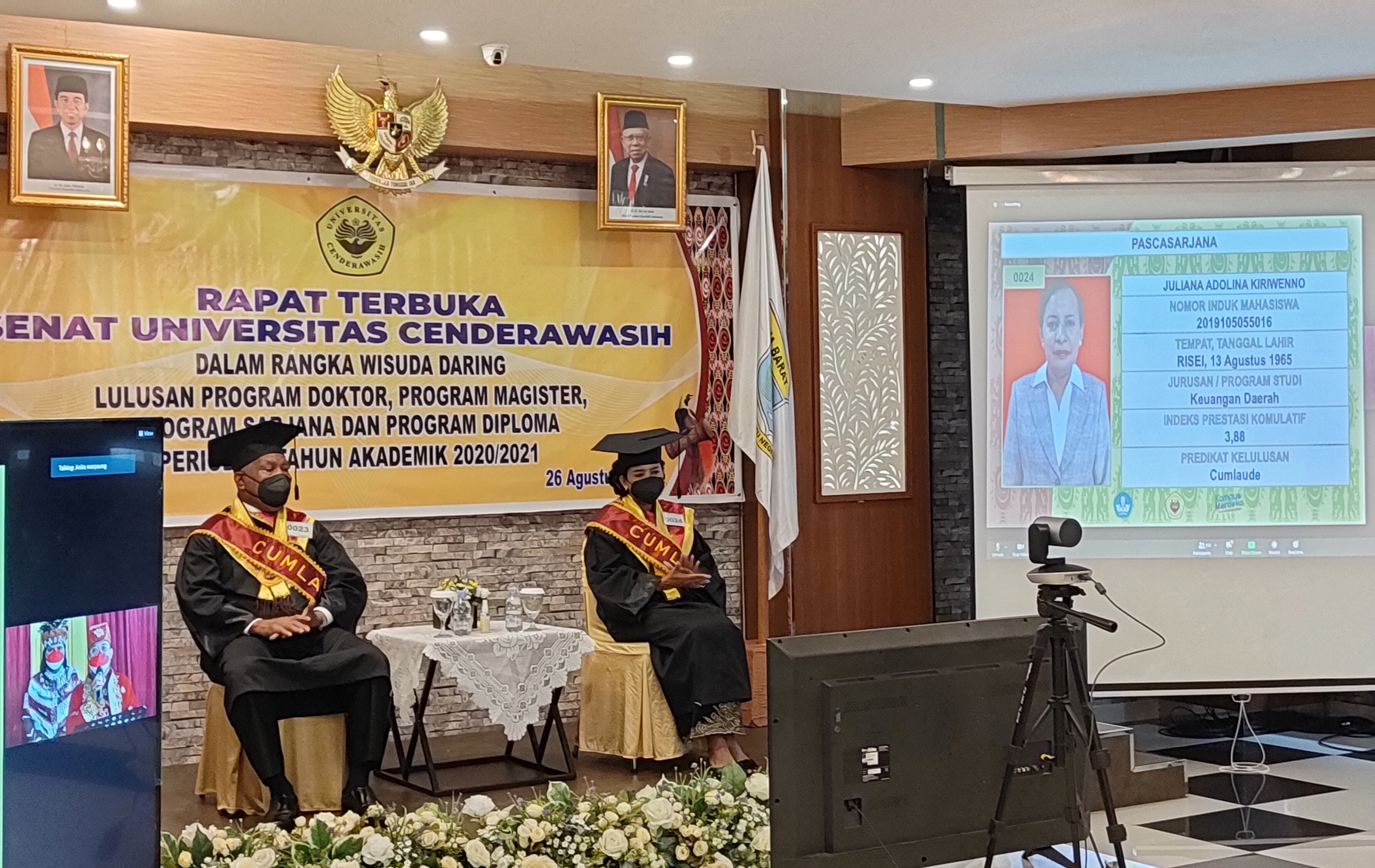 MANOKWARI- Kamis (26/8/2021) Rapat Terbuka Senat Universitas Cendrawasih dalam rangka wisuda daring lulusan program Doktor, Magister, Sarjana dan Diploma periode II Tahun Akademik 2020/2021. Gubernur bersama Istri yang juga merupakan Ketua Tim Penggerak PKK mengikuti wisuda daring didampingi sejumlah pimpinan OPD Papua Barat.