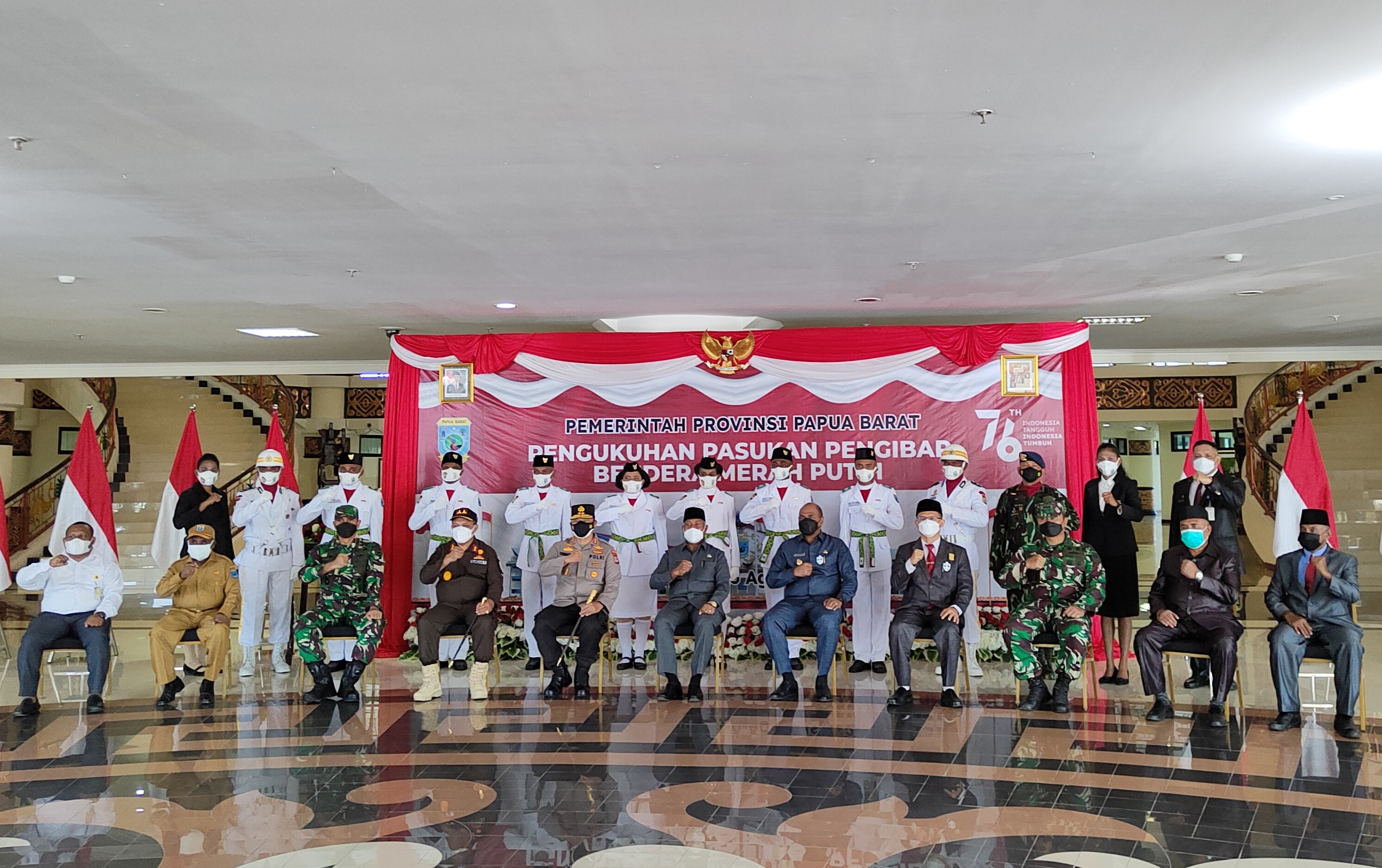 MANOKWARI- Gubernur Papua Barat, Drs. Dominggus Mandacan mengukuhkan 7 orang pasukan pengibar bendera merah putih pada peringatan Hut Kemerdekaan Indonesia Ke-76 tahun 2021. Upacara pengukuhan berlangsung di lobi utama Kantor Gubernur, Arfai, dan dihadiri para forkopimda, Senin (16/8/2021).