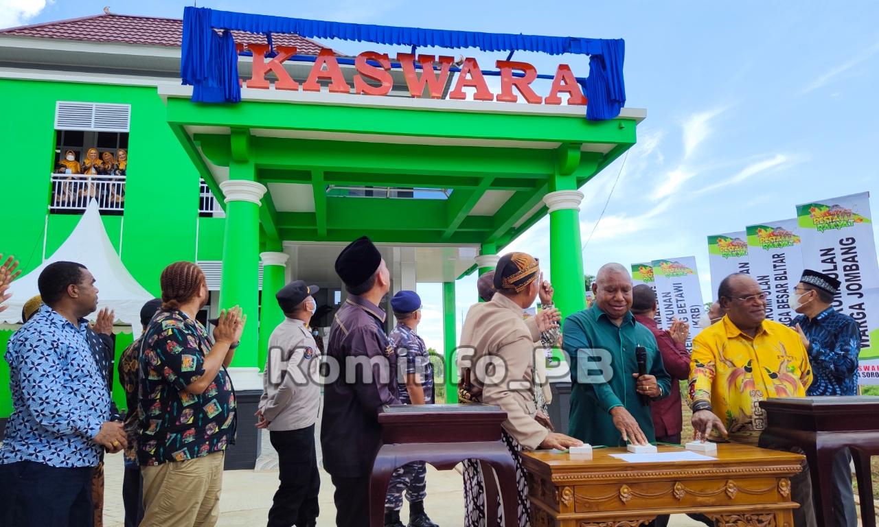 KOTA SORONG - Gubernur Papua Barat, Drs. Dominggus Mandacan,M.Si bersama Walikota Sorong meresmikan Gedung Sekertariat Ikatan Keluarga Sunda Jawa dan Madura (Ikaswara) Kota Sorong. Momen bersejarah itu ditandai dengan penandatanganan prasasti dan pembukaan selubung papan nama, Jumat (6/5/2022).