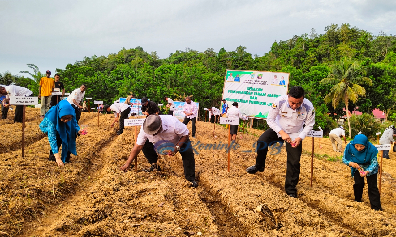 KAIMANA - Menjalankan program nasional dan mendukung ketahanan pangan lokal, Penjabat Gubernur Papua Barat, Drs. Ali Baham Temongmere,MTP didampingi Bupati Kabupaten Kaimana mencanangkan penanaman jagung, simbolis pada luasan areal satu hektar berlokasi di Jl. Batu Putih, Distrik Krooy. Sinergitas yang telah dilakukan akan diterapkan secara menyeluruh meliputi semua kabupaten Se-Papua Barat, mendorong partisipasi masyarakat meningkatkan produksi pangan secara mandiri, Rabu (10/1/2024) sore.