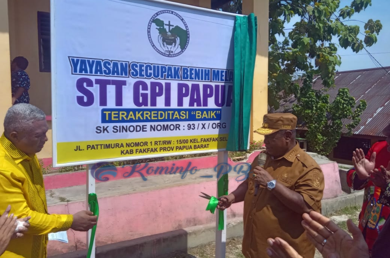 FAKFAK-Pada hari Senin, ( 12/11/2023 ), Penjabat Gubernur Papua Barat Drs. Ali Baham Temongmere,M.TP Menghadiri acara Yubelium ke 50 tahun, Sekolah Tinggi Theologia ( STT ) Gereja Protestan Indonesia ( GPI ) Tanah Papua. Disaat yang bersamaan juga, Pj. Gubernur berkesempatan meletakan batu pertama pembangunan asrama Yayasan Secupak Benih Melati, STT GPI Tanah Papua.
