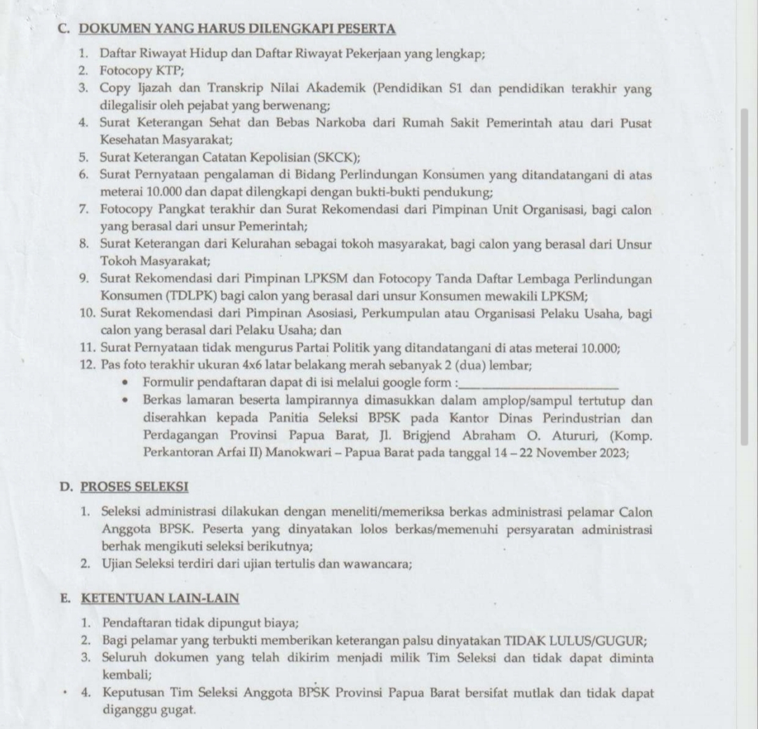 MANOKWARI - Pemerintah Provinsi Papua Barat melalui Dinas Perindustrian dan Perdagangan membuka seleksi Badan Penyelesaian Sengketa Konsumen (BPSK) periode 2024-2029. Pengumuman dan pendaftaran terjadwal 15 hingga 22 November 2023 dapat diakses secara online.
