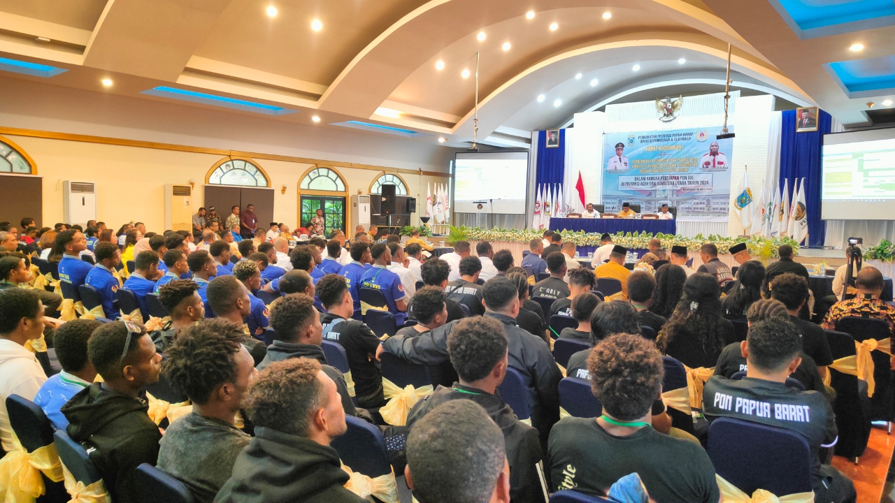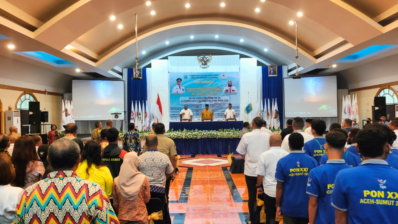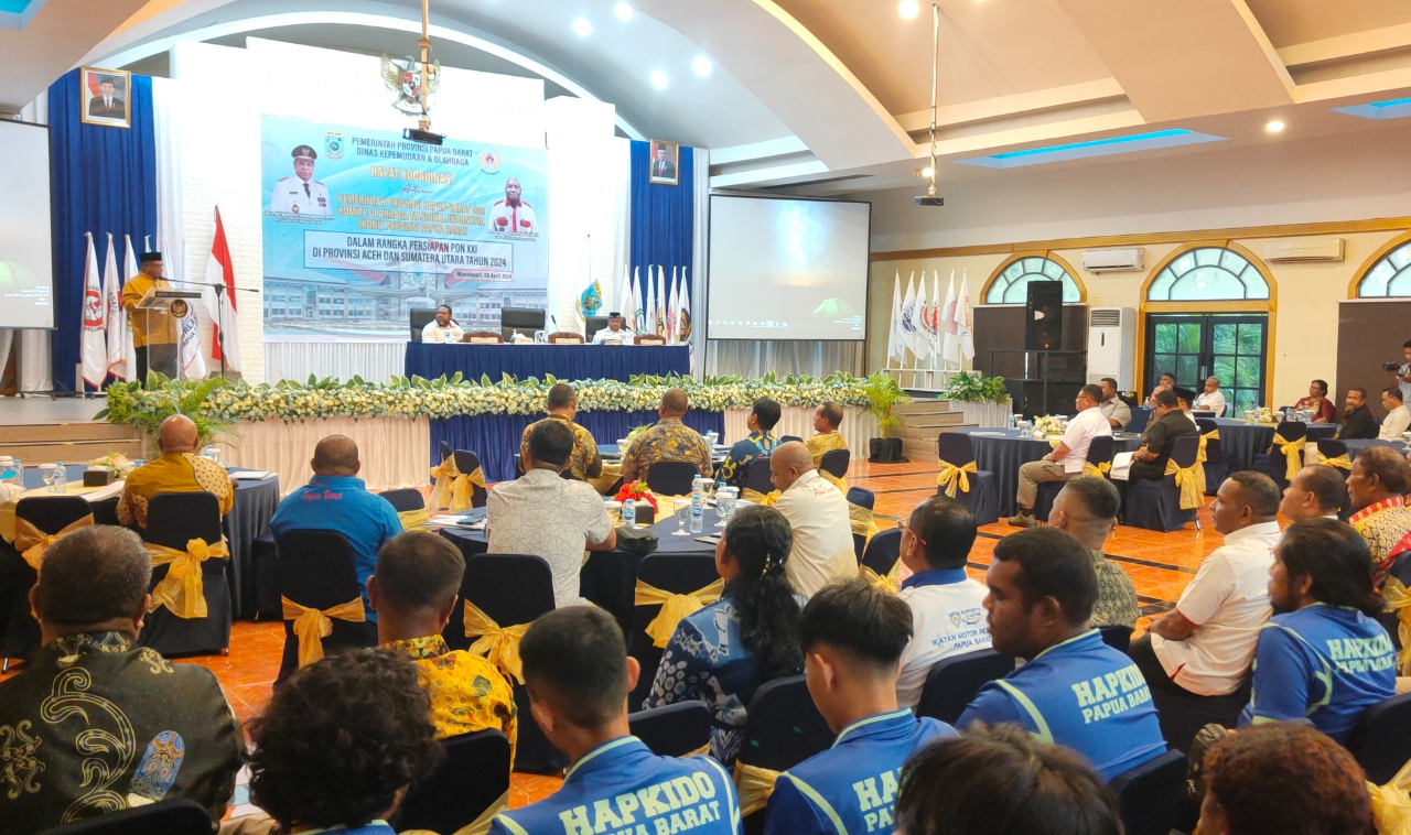 MANOKWARI - Pemerintah Papua Barat melalui Dinas Pemuda dan Olahraga menggelar rapat koordinasi bersama Komite Olahraga Nasional Indonesia (KONI) Papua Barat dalam rangka persiapan PON XXI Aceh-Sumut 2024, diikuti ratusan atlit maupun official. Acara yang dihadiri langsung Pj. Gubernur Papua Barat, Drs. H. Ali Baham Temongmere,MTP tersebut turut dirangkai buka puasa bersama, Senin (8/4/2024).