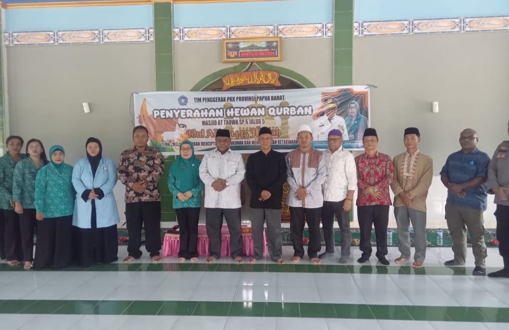 MANOKWARI-Tim Penggerak ( TP ) PKK provinsi Papua Barat, menyumbang hewan kurban beruapa satu ekor sapi kepada Jemaah Masjid At Taqwa SP 6 jalur 5, kampung Bowi Subur, distrik Masni Kabupaten Manokwari, sabtu, ( 15/06/2024 ), dalam rangka Idhul Adha 1445 H.