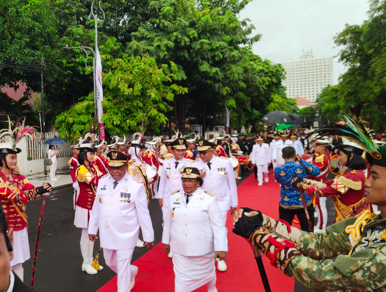 SURABAYA - Penjabat Gubernur Papua Barat, Drs. Ali Baham Temongmere,MTP menghadiri peringatan Hari Otonomi Daerah Ke-XXVIII yang dipusatkan pada balai Kota Surabaya, Jawa Timur. Bertindak selaku Inspektur Upacara, Menteri Dal Negeri RI, M. Tito Karnavian, dengan mengusung tema sentral “Otonomi daerah berkelanjutan menuju ekonomi hijau dan lingkungan yang sehat” dihadiri ratusan kepala daerah se-Indonesia, Kamis (25/4/2024).