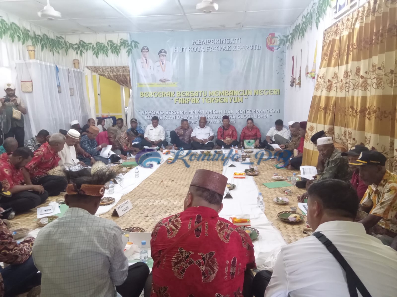 FAKFAK- Penjabat Gubernur Papua Barat, Drs. Ali Baham Temongmere,M.TP mengikuti Wewowo ( kerapatan adat ) dalam rangka memperingati hari ulang tahun ke 123 tahun, rabu, ( 15/11/2023 ). Dipusatkan pada kediaman petuanan raja Fathagar dan dihadiri raja dari tujuh petuanan, yakni petuanan raja Fathagar sebagai tuan rumah, raja Ati-Ati, raja Rumbati, raja Pik-Pik Sekar, raja Wertuar, raja Pattipi, raja Arguni.