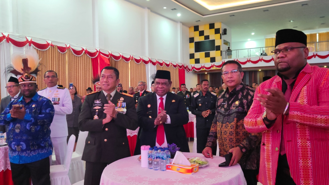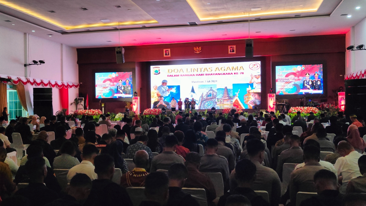 MANOKWARI - Penjabat Gubernur Papua Barat, Drs. Ali Baham Temongmere,MTP menghadiri syukuran Hari Bhayangkara Ke-78 dipusatkan pada Arfak Convention Hall. Mendasari momen spesial tersebut diawali rangkaian doa lintas agama, mengusung tema "Polri Presisi Mendukung Percepatan Transformasi Ekonomi Yang Inklusif dan Berkelanjutan Menuju Indonesia Emas", Senin (1/7/2024).
