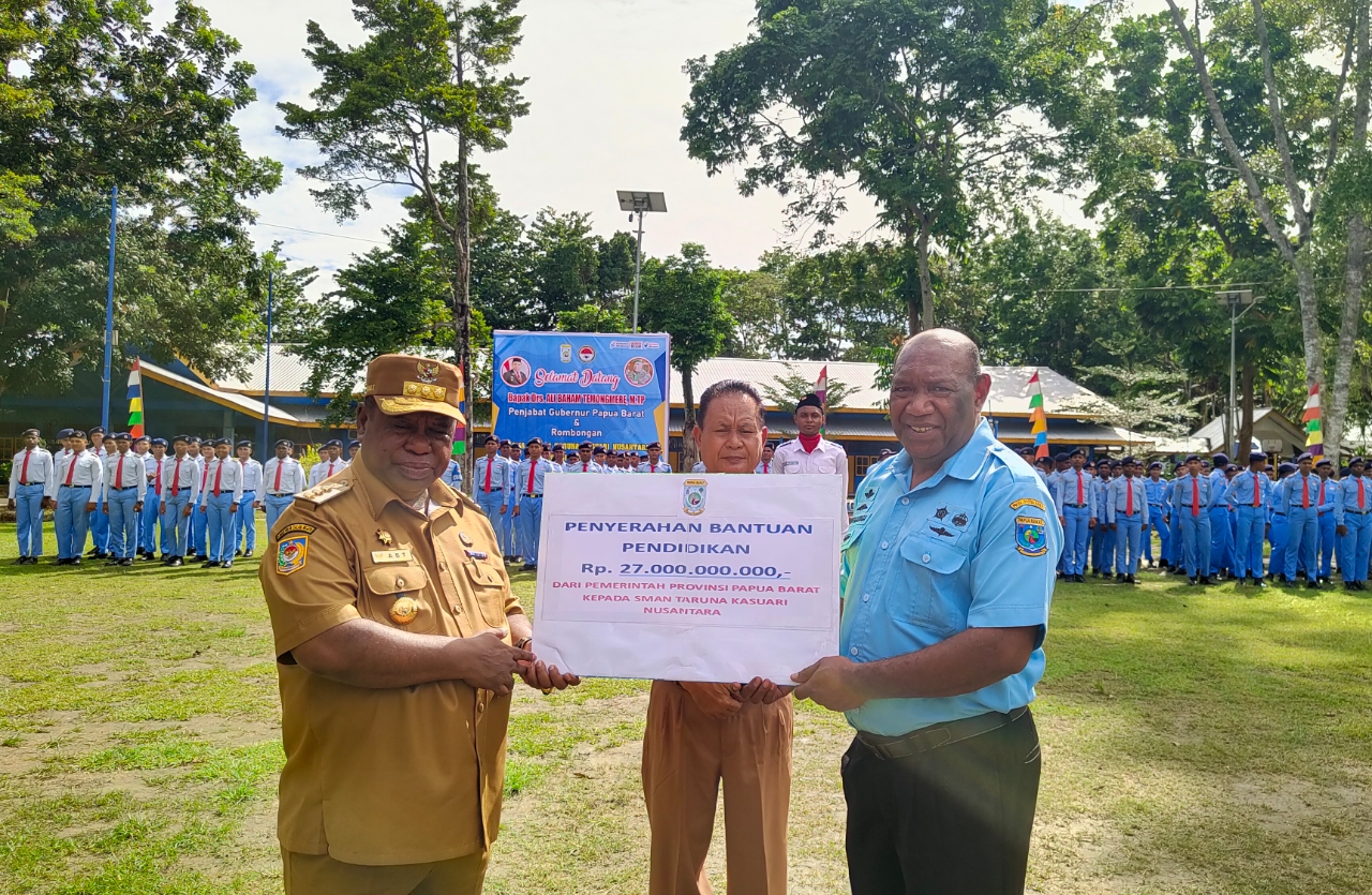 Dalam kesempatan itu Pj. Gubernur Papua Barat menyerahkan bantuan dana hibah sebesar 27 miliar. Terbagi, 2 miliar sebagai biaya operasional dan 25 miliar rupiah untuk belanja modal diterima Kepala SMA Taruna Kasuari Nusantara Papua Barat, Brigjend TNI Yusuf Ragainaga. Selain itu penyerahan Peraturan Gubernur nomor 10 tahun 2024 tentang penyelenggaraan pendidikan khusus bagi sekolah menengah atas negeri Taruna Kasuari Nusantara Papua Barat.