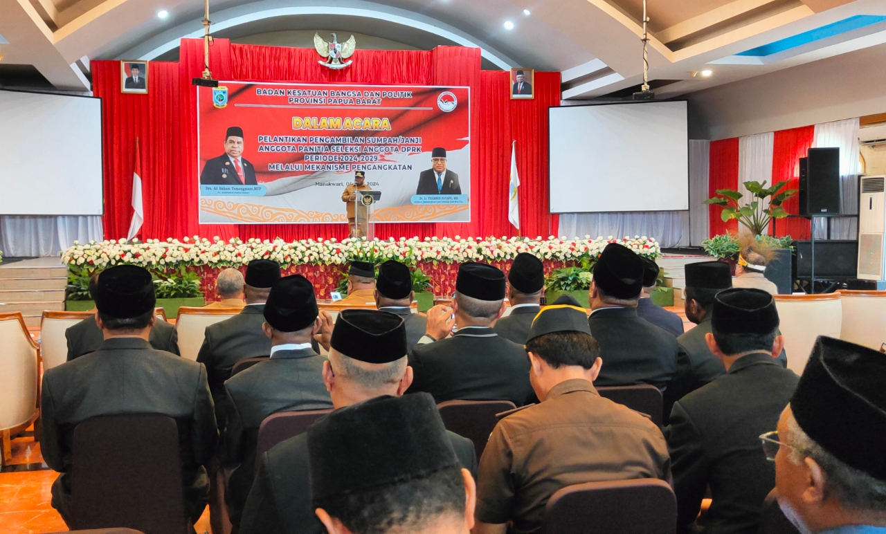 MANOKWARI - Penjabat Gubernur Papua Barat, Drs. Ali Baham Temongmere,MTP resmi melantik anggota panitia seleksi Anggota DPRK periode 2024-2029 melalui mekanisme pengangkatan. Ia juga mengapresiasi kinerja panitia pemilihan yang telah bergerak cepat dan pembentukan pansel pada 7 kabupaten dapat berjalan tepat waktu, Selasa (4/6/2024) dipusatkan pada salah satu hotel.