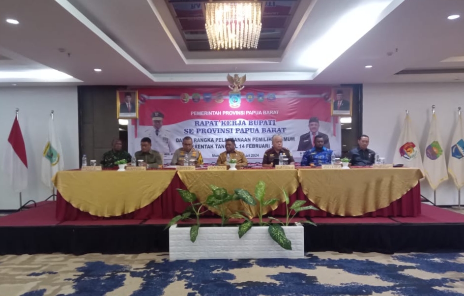 MANOKWARI-Rapat kerja bupati se-provinsi Papua Barat dalam rangka pelaksanaan pemilihan umum (Pemilu) serentak tanggal 14 februari 2024, berlangsung pada salah satu hotel dalam kota Manokwari, ( 06/02/2024 ).