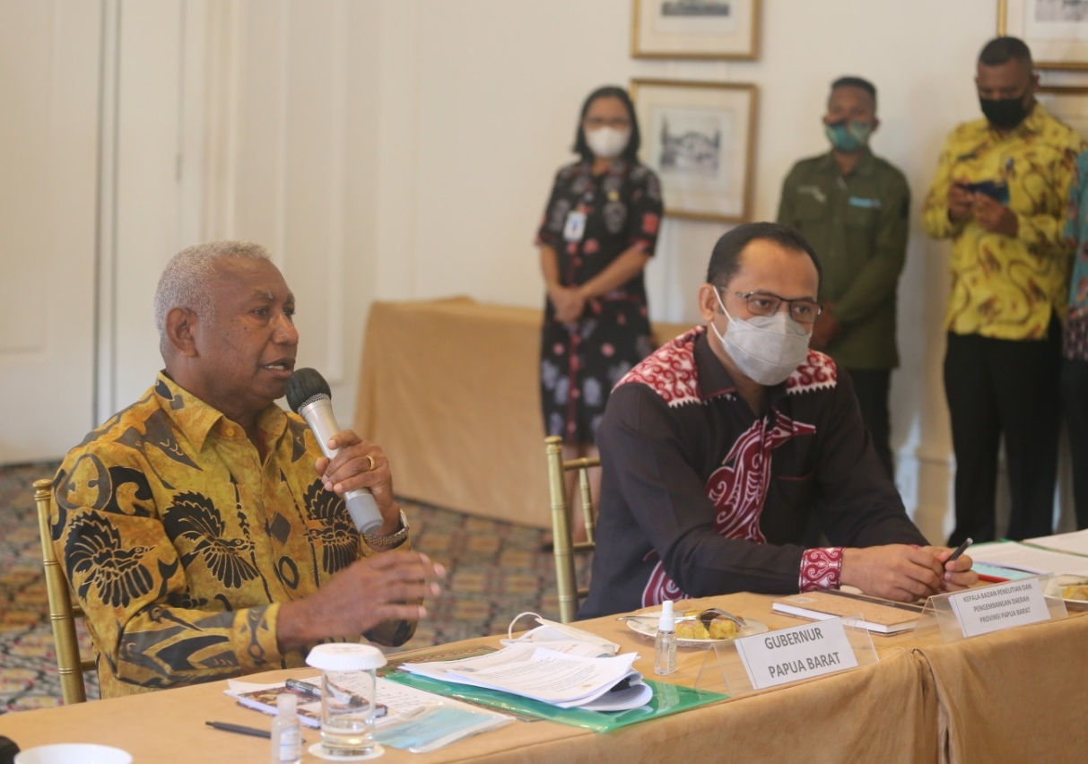 JAKARTA- Gubernur Papua Barat, Drs. Dominggus Mandacan didampingi Kepala Balitbangda Papua Barat, Prof. Dr. Charlie D Heatubun S.Hut M.Si, serta Konsorsium Proyek StAR mengadakan rapat koordinasi tingkat tinggi implementasi Proyek StAR, Kamis (27/5/2021).