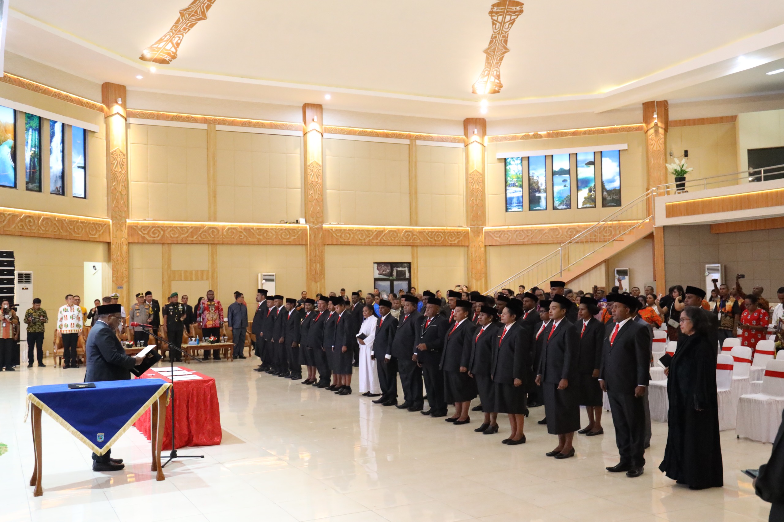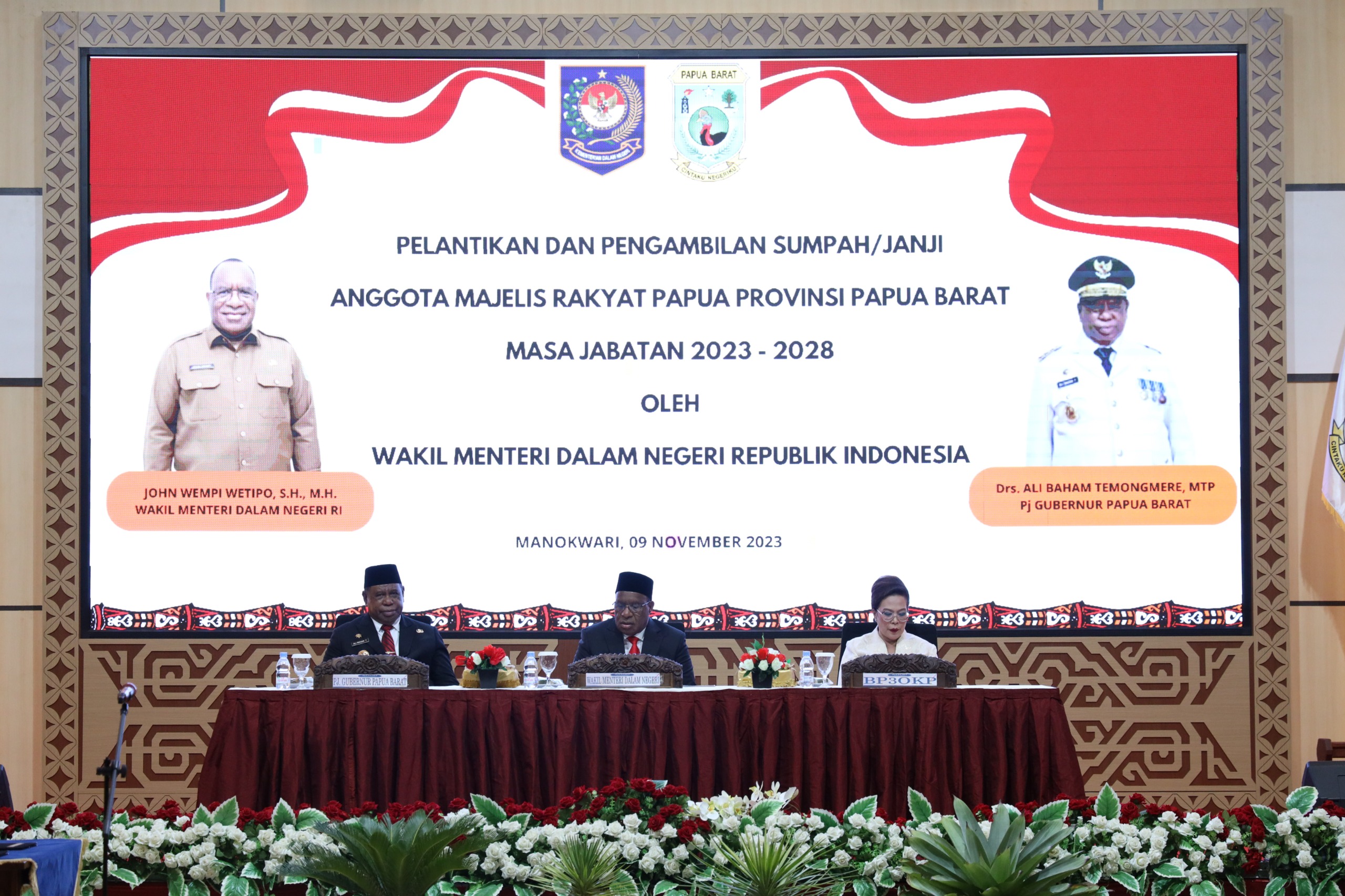 Manokwari-Pelantikan dan Pengambilan Sumpah Janji Anggota Majelis Rakyat Papua Provinsi Papua Barat Masa Jabatan 2023-2028 oleh Wakil Menteri Dalam Negeri Republik Indonesia Jhon Wempi Wetipo, S.H.,M.H.. Kamis, 9/11/2023, bertempat di gedung PKK Arfai.
